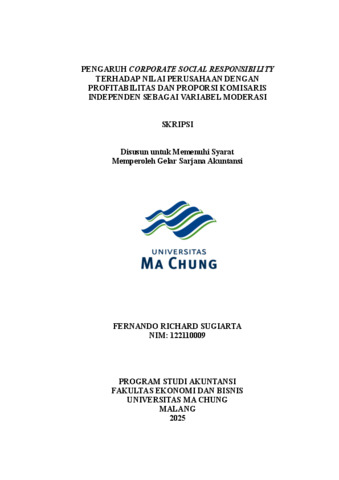 FERNANDO RICHARD, SUGIARTA PENGARUH CORPORATE SOCIAL RESPONSIBILITY TERHADAP NILAI PERUSAHAAN DENGAN PROFITABILITAS DAN PROPORSI KOMISARIS INDEPENDEN SEBAGAI VARIABEL MODERASI. [TA] (Unpublished)
