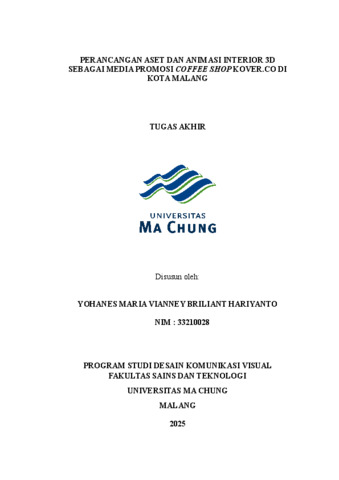 YOHANES MARIA VIANNEY BRILIANT, HARIYANTO PERANCANGAN ASET DAN ANIMASI INTERIOR 3D SEBAGAI MEDIA PROMOSI COFFEE SHOP KOVER.CO DI KOTA MALANG. [TA] (Unpublished)