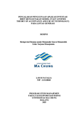 LOUIS, NATALIA PENGALAMAN PENGGUNAAN APLIKASI INVESTASI BIBIT MENGGUNAKAN MODEL UTAUT (UNIFIED THEORY OF ACCEPTANCE AND USE OF TECHNOLOGY) PADA LINTAS GENERASI. [TA] (Unpublished)