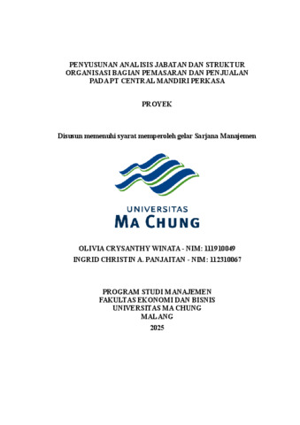 OLIVIA CRYSANTHY, WINATA and INGRID CHRISTIN A., PANJAITAN PENYUSUNAN ANALISIS JABATAN DAN STRUKTUR ORGANISASI BAGIAN PEMASARAN DAN PENJUALAN PADA PT CENTRAL MANDIRI PERKASA. [TA] (Unpublished)