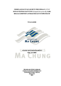 AGATHA TRI ENDAH, PRAMESTI FORMULASI DAN EVALUASI MUTU FISIK SEDIAAN LOTION DENGAN EKSTRAK DAUN UNGU (Graptophyllum pictum (L.) Griff.) SEBAGAI KOMPONEN ANTIBAKTERI DAN FOTOPROTEKTIF. [TA] (Unpublished)