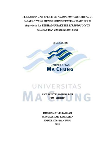 ANNISA PUTRI SOFIANA, ROSI PERBANDINGAN EFEKTIVITAS MOUTHWASH HERBAL DI PASARAN YANG MENGANDUNG EKSTRAK DAUN SIRIH (Piper betle L.) TERHADAP BAKTERI STREPTOCOCCUS MUTANS DAN ESCHERICHIA COLI. [TA] (Unpublished)