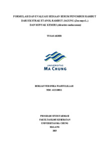 | Uncontrolled Keywords: | emulsi, ekstrak rambut jagung, minyak kemiri, mutu fisik, pertumbuhan rambut, serum rambut. |