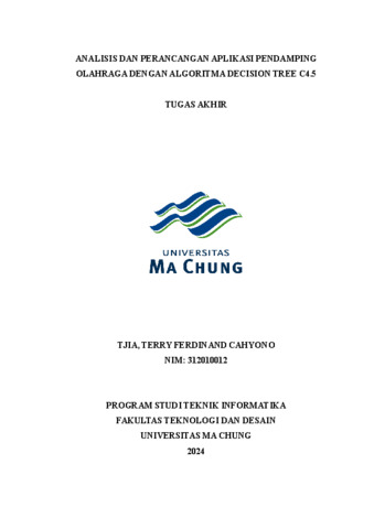 TJIA, TERRY FERDINAND CAHYONO (2024) ANALISIS DAN PERANCANGAN APLIKASI PENDAMPING OLAHRAGA DENGAN ALGORITMA DECISION TREE C4.5. Tugas Akhir/Skripsi thesis, Universitas Ma Chung.