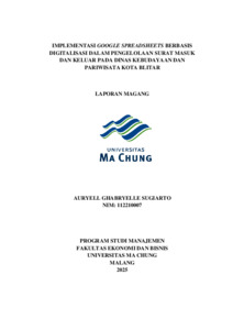AURYELL GHABRYELLE, SUGIARTO IMPLEMENTASI GOOGLE SPREADSHEETS BERBASIS DIGITALISASI DALAM PENGELOLAAN SURAT MASUK DAN KELUAR PADA DINAS KEBUDAYAAN DAN PARIWISATA KOTA BLITAR. [PKL] (Submitted)