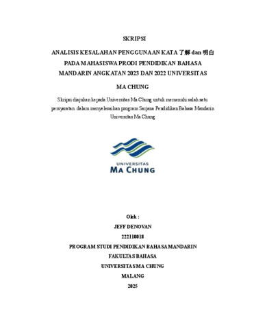 JEFF, DENOVAN ANALISIS KESALAHAN PENGGUNAAN KATA 了解 dan 明白 PADA MAHASISWA PRODI PENDIDIKAN BAHASA MANDARIN ANGKATAN 2023 DAN 2022 UNIVERSITAS. [TA] (Submitted)