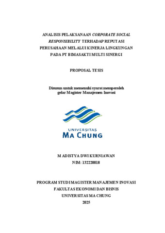 M ADISTYA DWI, KURNIAWAN (2025) ANALISIS PELAKSANAAN CORPORATE SOCIALRESPONSIBILITY TERHADAP REPUTASI PERUSAHAAN MELALUI KINERJA LINGKUNGANPADA PT BIMASAKTI MULTI SINERGI. Masters thesis, Universitas Ma Chung.
