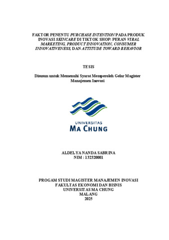 ALDELYA NANDA, SABRINA (2025) FAKTOR PENENTU PURCHASE INTENTION PADA PRODUK INOVASI SKINCARE DI TIKTOK SHOP: PERAN VIRAL MARKETING, PRODUCT INNOVATION, CONSUMER INNOVATIVENESS, DAN ATTITUDE TOWARD BEHAVIOR. Masters thesis, Universitas Ma Chung.